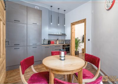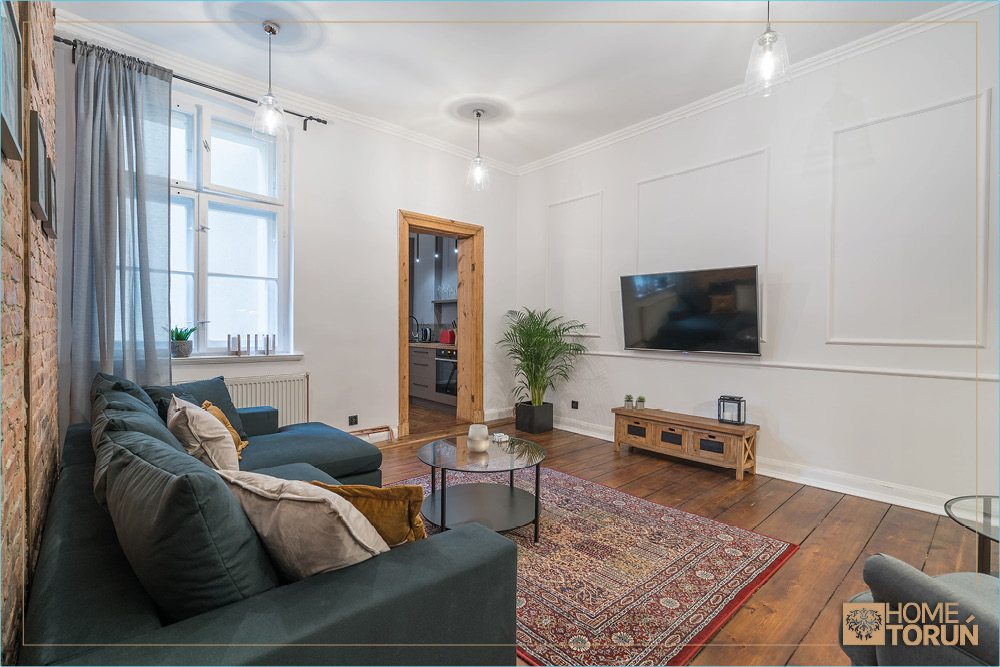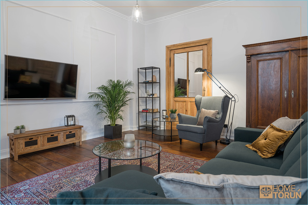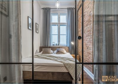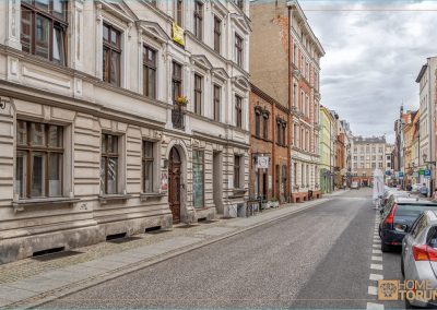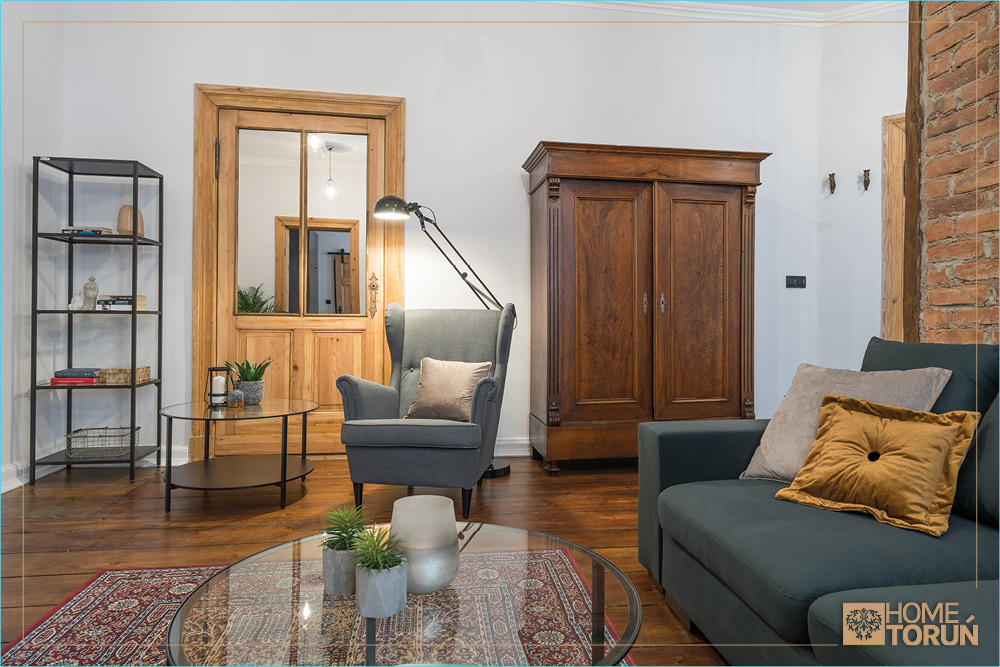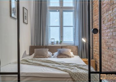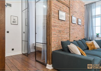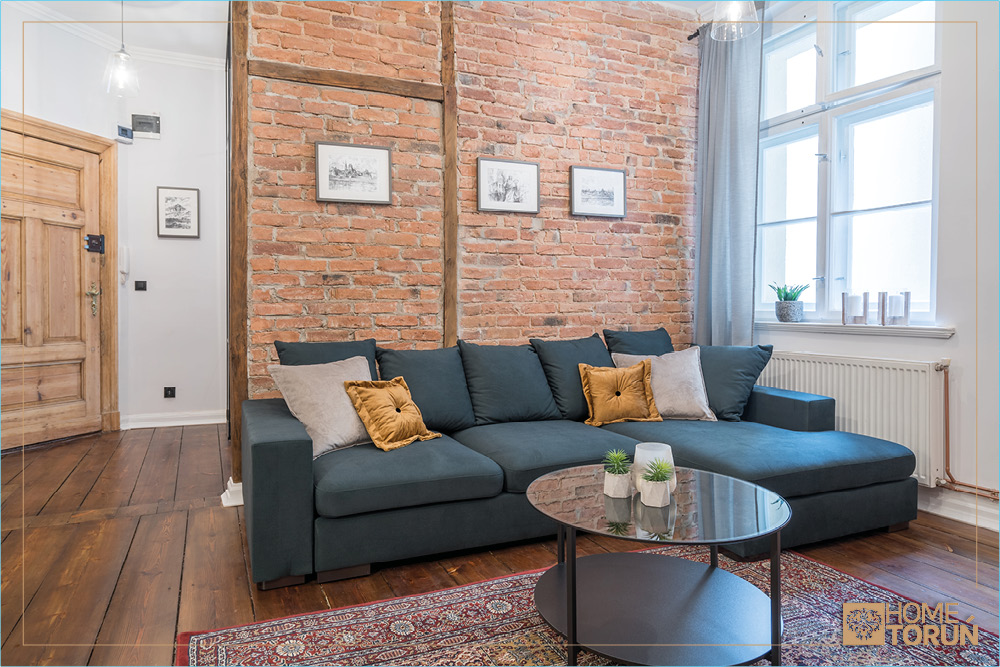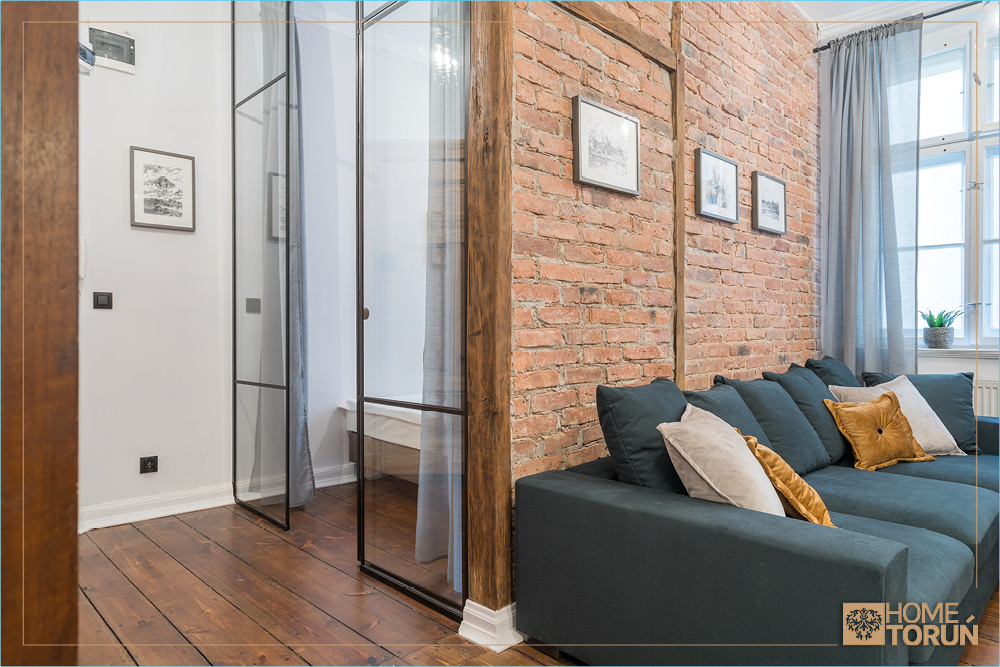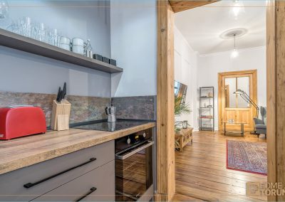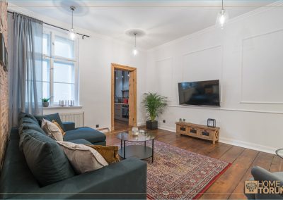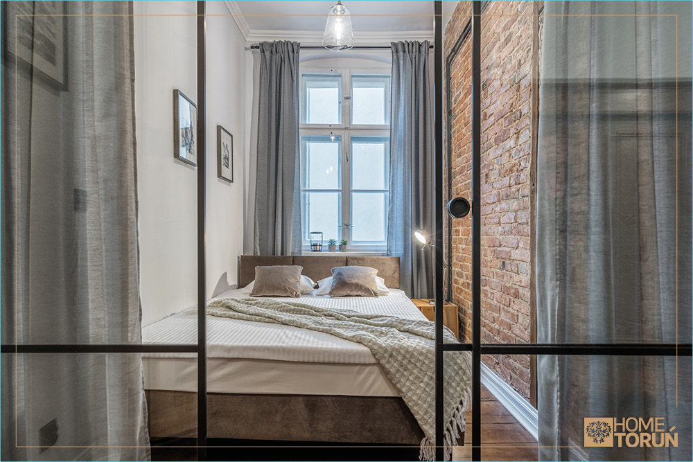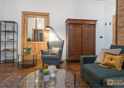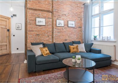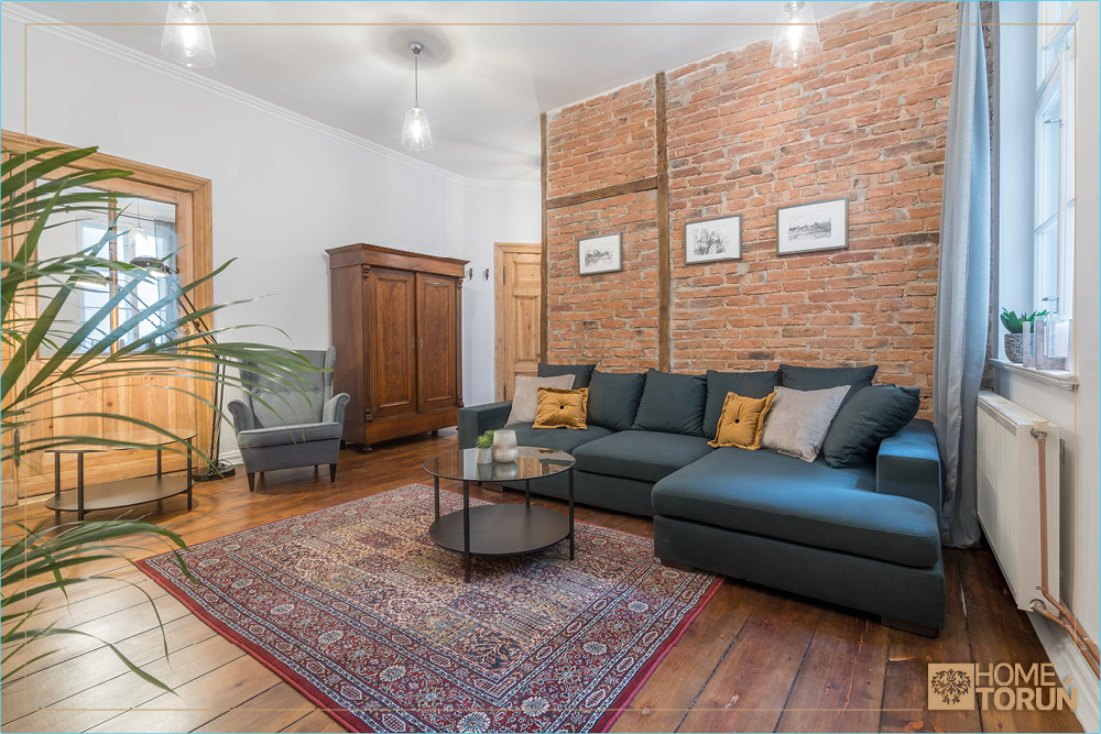 Mieszkanie znajduje się w kamienicy na toruńskiej starówce, wszystkie jego okna wychodzą na niewielki dziedziniec.