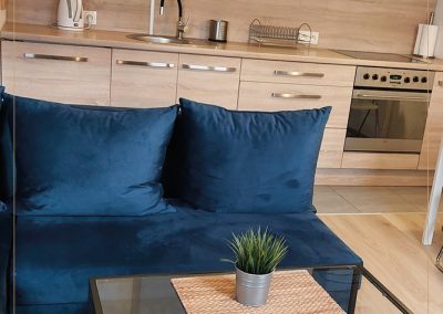 W apartamencie znajdą Państwo salon z aneksem kuchennym oraz rozkładanym narożnikiem, sypialnie z pełnowymiarowym łóżkiem i nowocześnie urządzoną łazienkę.
